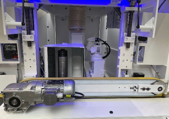 L’arbre est conçu pour empiler les outils, ce qui vous permet de traiter différents profilés de porte d’armoire de cuisine, sans réglage manuel entre les différents profilés. La table en acier robuste et l’encoche pour le profilé de l’arbre vertical contribuent à améliorer la précision. Les buses d’air dans la table créent un coussin d’air entre la pièce et la surface de la machine pour un meilleur passage. Le guide extérieur automatique vous permet de passer en douceur d’une pièce à l’autre de différente largeur.