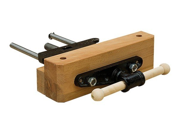 - Guide métallique, 2 mâchoires en bois, étau de serrage et vis de fixation.